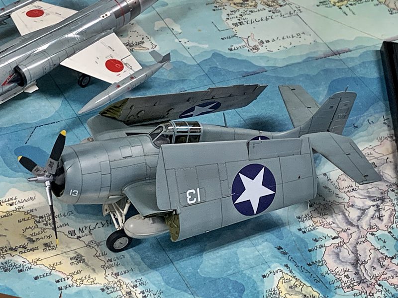 鈴木会員の作品です。 アカデミー 1/48 F4F-4です。 なんか・・・機首がたくましい感じ、F6Fみたい。 なんといってもこのキットはウイングフォールド出来るのがポイントですね。