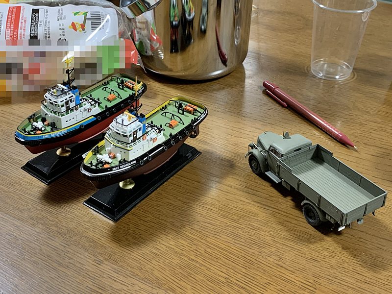 今年最後の部会を開催しました。 タグボートはアオシマ 1/200 シュミット・ネダーランドです。 奥のブルーのラインが入っているのが自分(清水会員)の作品です。 手前は中井会員の作品です。 何の申し合わせもしていないのにこんなレアキットを製作するとは何たる偶然。すごい確率だねぇ。