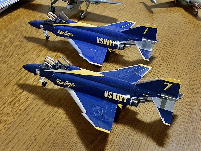 今泉会員の作品です。 続々とブルーエンジェルスが完成しています。 手前はハセガワだそうです。 機首のラインは圧倒的にファインモールドが良いです。 しかし、ハセガワの方が好みという方もいるでしょうね。